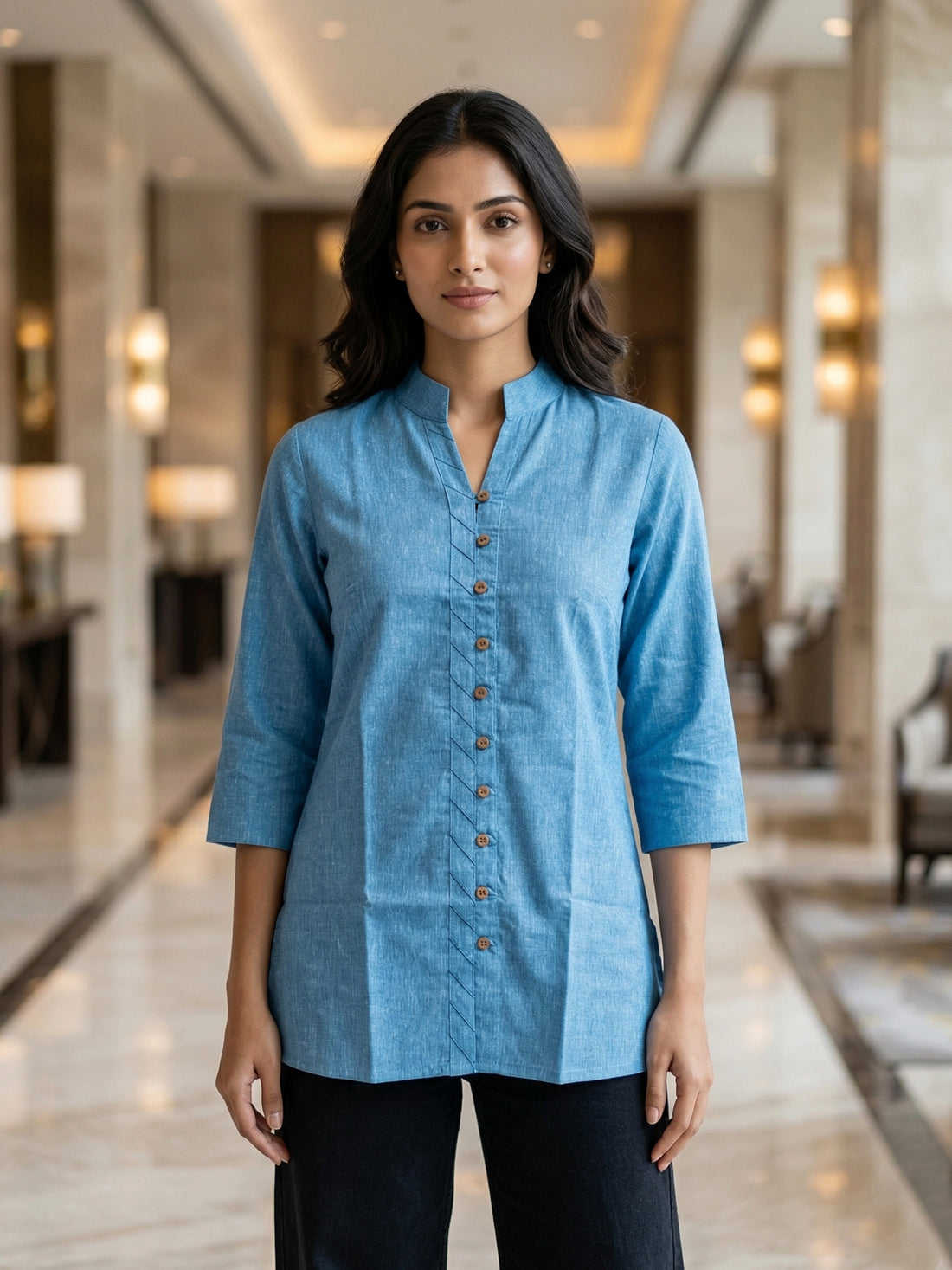 SkyBlue Handloom Cotton Front-Slit Short Kurti